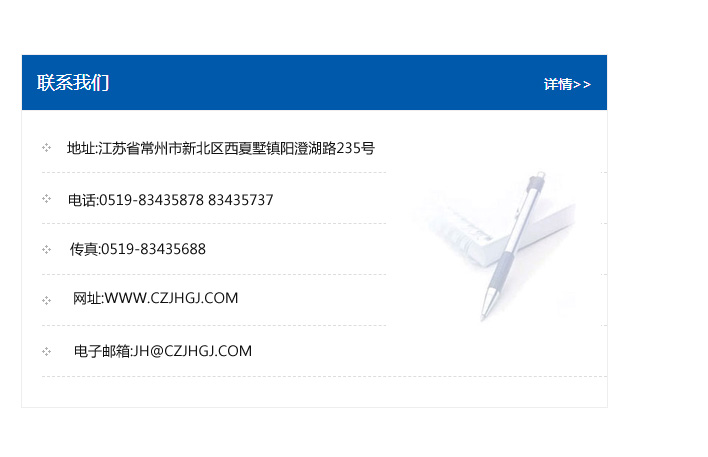 傳真:0519-83435688    郵編:213135    網址:WWW.czjhgj_com.czhongzhan.com    電子郵箱:JH@czjhgj_com.czhongzhan.com